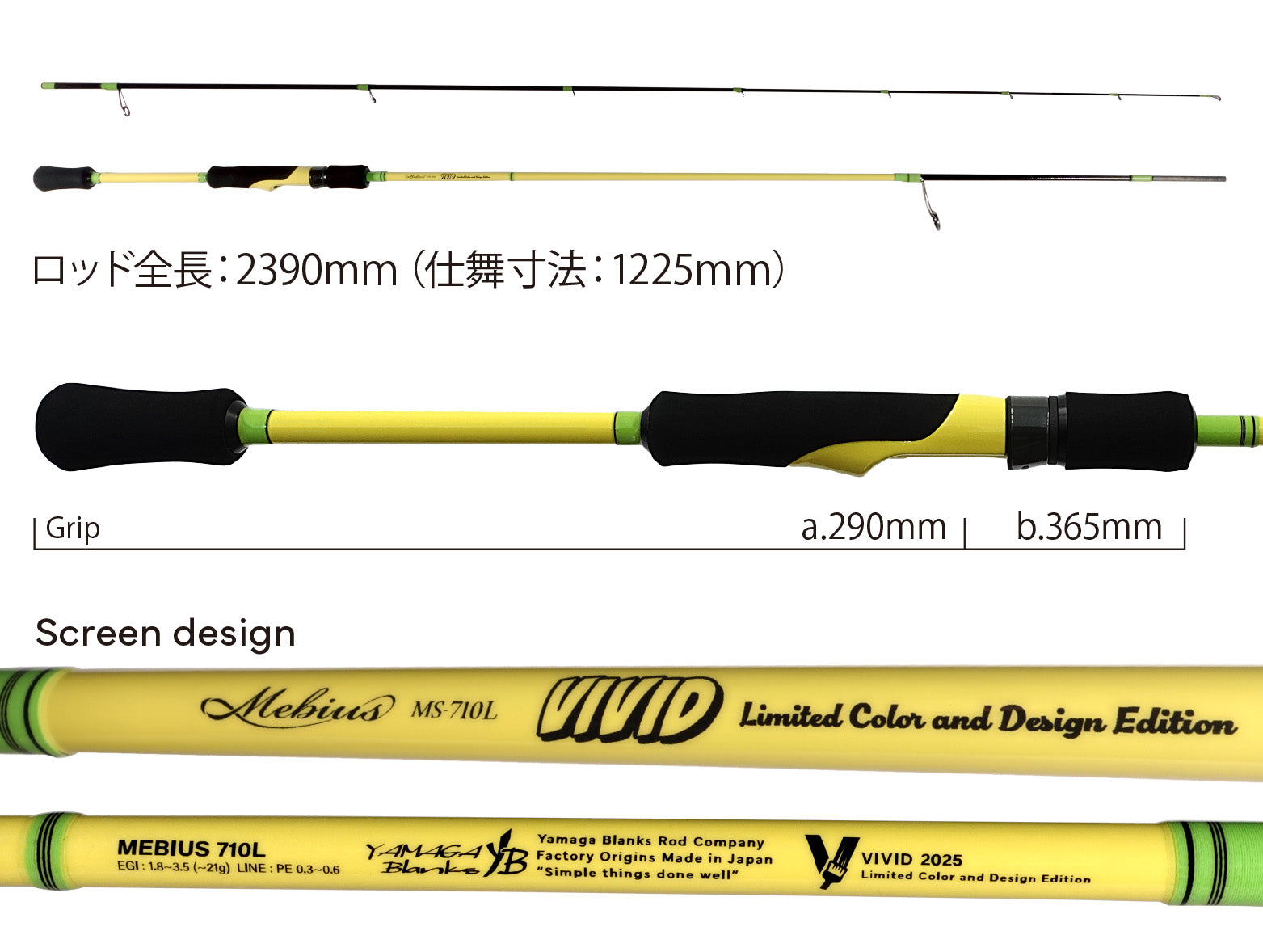 Launching as the first release is the “Mebius 710L” from the eging rod series “Mebius.” Built around a soft pastel yellow base, it’s accented with light green thread and black highlights, resulting in a vibrant, fun, and eye-catching colour scheme.